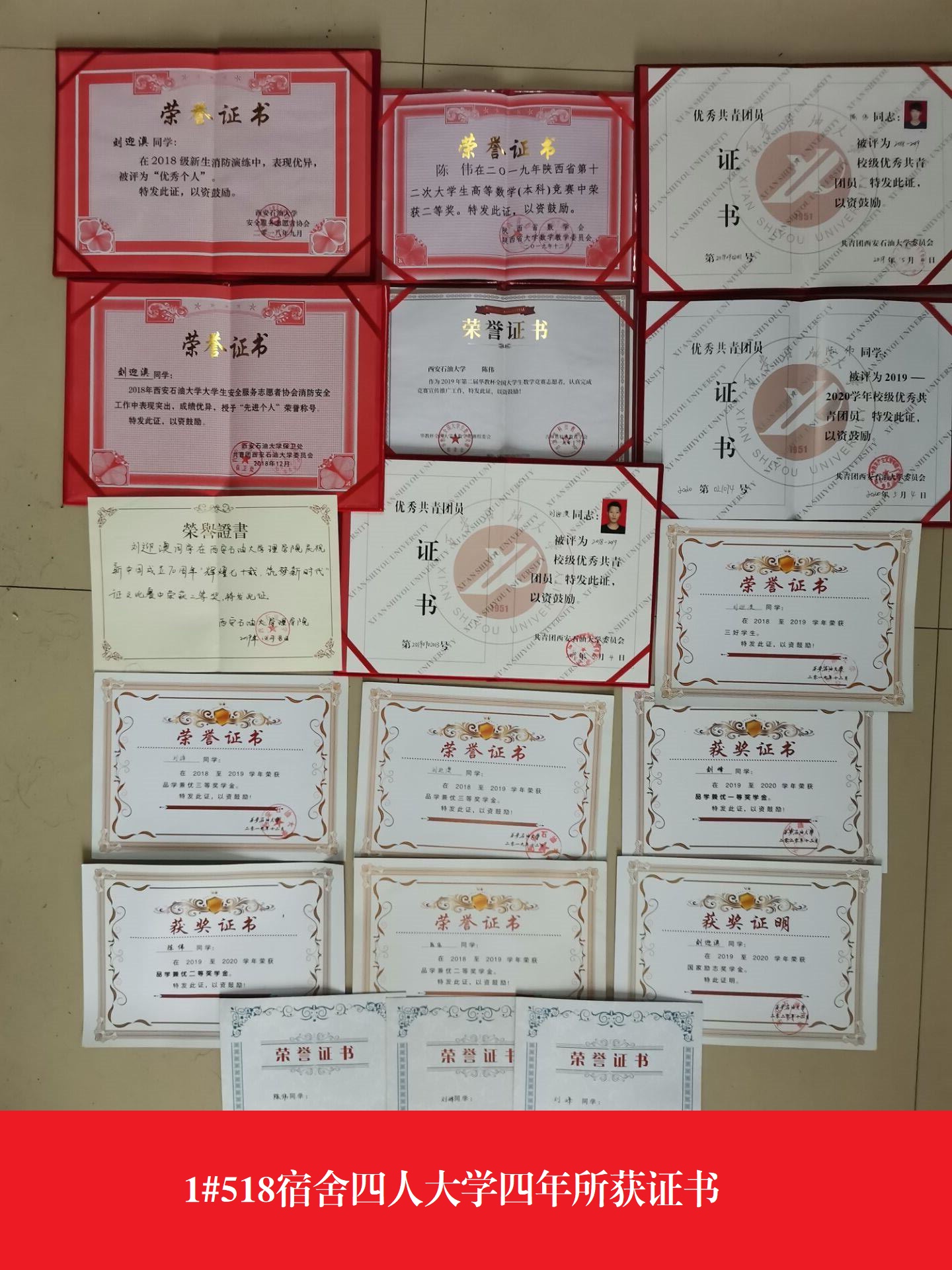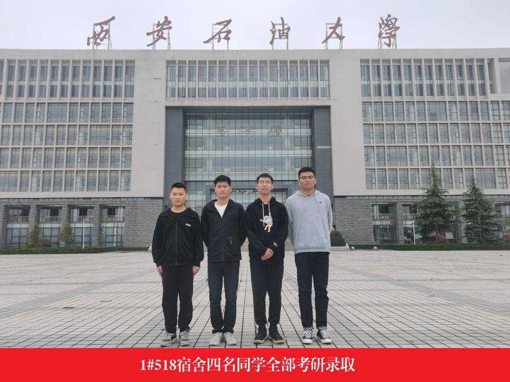 在诸多优秀学子中,1#518宿舍的四位同学全部被考研录取,格外引人注目。该宿舍刘迎澳、刘峰同学被西安电子科技大学录取,陈伟同学被华南师范大学录取,万希智同学被西安工业大学录取,宿舍四人全员上岸,“学霸”宿舍,实至名归。1#518的宿舍四名同学在日常学习中刻苦努力,积极参与学术竞赛,多次获得国家奖学金、品学兼优奖学金等荣誉。在考研期间互相监督,彼此鼓励,每天晚上在宿舍分享今日备考遇到的问题或发现的知识漏洞。最终,一路相伴,“研”途圆梦。