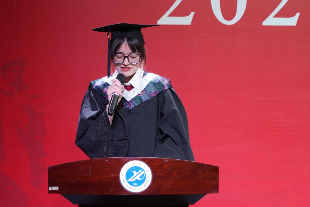 2022届毕业生代表潘菻颍同学代表公司全体本科生发言。首先,她代表全体本科毕业生们向多年来给予辛勤教诲的各位老师致以衷心的感谢和崇高的敬意。随后,她回首四年求学时光珍贵瞬间,从军训、文艺晚会、竞赛活动到一场难忘的考试,那些与老师们、同学们相处的点点滴滴将是温暖未来岁月的宝贵财富。最后,她表示,作为一名新时代的青年,将永远不忘母校的辛勤栽培,要以实现中华民族伟大复兴为己任,增强做中国人的志气、骨气、底气,不负时代,不负韶华,不负党和人民的殷切期望。